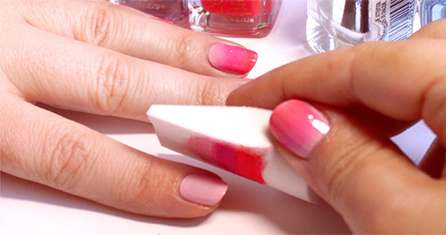 – ส่วนแบบนี้จะเป็นการไล้เฉดสี การทำแบบนี้ก็คือทาสีพื้น โดยส่วนมากจะเป็นสีขาวลงไปก่อนนะคะ แล้วหยดน้ำยาทาเล็บลงบนพาชนะ ไล่ลงมาสัก 3 สีแล้วเอาฟองน้ำซับสีเล็บจนชุ่มแล้วเอามาทาบบนเล็บเราค่ะ ยุ่งยากนิดนึง แต่สวยสดใสดีค่ะ ^0^