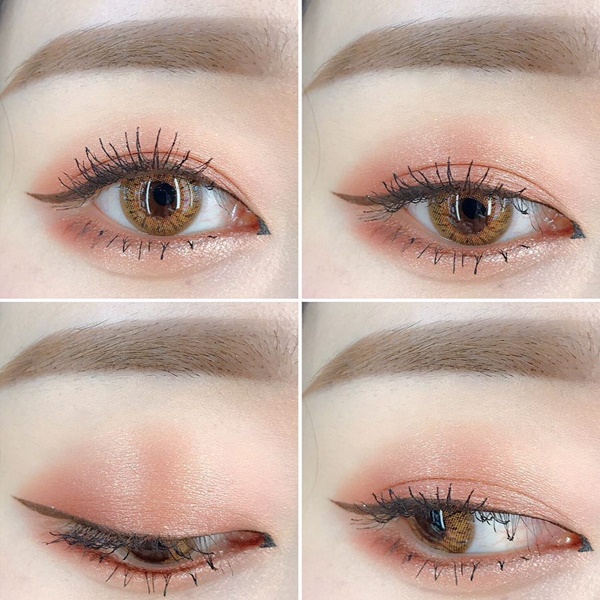 - ทาอายแชโดว์สีชมพูพีชให้ทั่วเปลือกตาบน และขอบตาล่าง