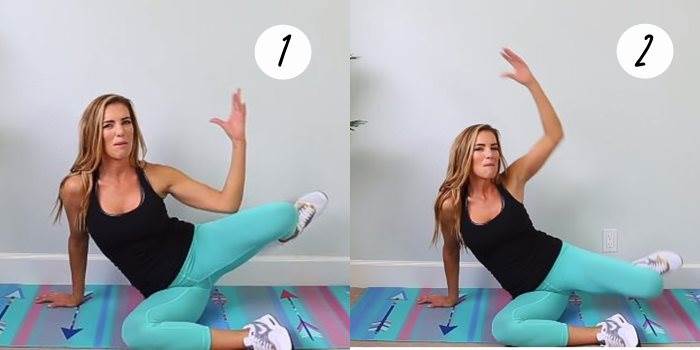 ขั้นตอนที่ 3. เปลี่ยนท่ามานั่งพับขาบ้างนะคะ โดยขาข้างหนึ่ง จะต้องทำมุมฉากพร้อมกับชูแขนขึ้นข้างหนึ่ง โดยท่านี้ขาและแขนจะสัมพันธ์กันนะคะ คือเมื่อยกขาขึ้นให้สูง ก็ให้ลดแขนลงมาให้ข้อศอกแตะกับขานับเป็น 1 ครั้งค่า ทำครบ 10 ครั้งก็เปลี่ยนท่าได้เลยค่า อย่าลืมยืดกล้ามเนื้อหลังทำท่านี้กันด้วยนะคะ