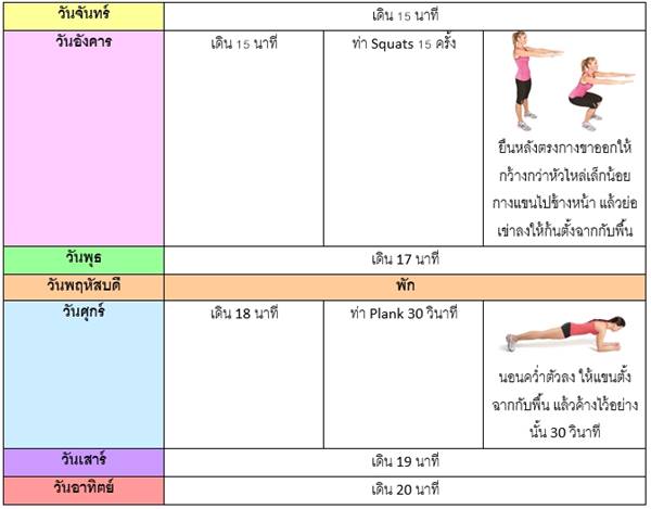 วันอังคาร : เดิน 15 นาที แล้วต่อด้วยท่า Squats 15 ครั้ง ยืนหลังตรงกางขาออกให้กว้างกว่าหัวไหล่เล็กน้อย กางแขนไปข้างหน้า แล้วย่อเข่าลงให้ก้นตั้งฉากกับพื้น