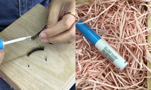 เราไม่สามารถเอาขนตาปลอมไปติดตาเราดื้อๆได้ ฉะนั้นควรที่จะทากาวกับขนตาก่อน แต่การที่จะทากาวนั้นควรวัดความยาวของตาเราและขนตาปลอมเพื่อให้มันพอดีกัน *เคล็ดลับ ถ้าอยากให้ขนตาปลอมงอนขึ้นให้ทำการดัดมันตอนนี้เลยก่อนที่เราจะทากาวกับขนตาปลอม กาวขนตาปลอมที่ใช้คือ Bohktoh