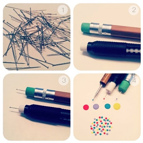 เพียงแค่สาวๆ นำตะปูตัวเล็กๆ มาปักเข้ากับยางลบ เท่านี้สาวๆ ก็จะได้ตัวตะปูไว้สำหรับการเพ้นท์ลายจุดที่ง่ายแสนง่ายกว่าการใช้พู่กันอีกค่ะ แถมยังมีหลายขนาดแล้วแต่หัวตะปูที่สาวๆ เลือกมาอีกด้วยค่ะ