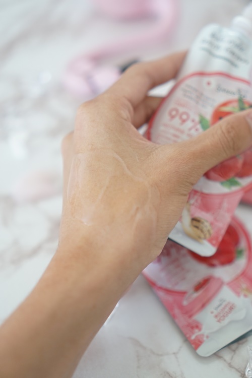 ทั้งยังมาพร้อมเนื้อสัมผัสบางเบาในรูปแบบเจลสีชมพูใสๆ และมีกลิ่นหอมอ่อนๆ เป็นธรรมชาติ ดังนั้นใครที่กำลังกังวลเรื่องของกลิ่นมะเขือเทศคือลืมไปได้เลยค่ะ ในส่วนของสัมผัสแรกเวลาทาลงบนผิวหน้าจะรู้สึกได้เลยว่าผิวสดชื่นขึ้นทันที เพราะมีความเย็นนิดๆ หลังจากนั้นเนื้อเจลจะค่อยๆ ซึมซาบเข้าสู่ผิว โดยไม่ทิ้งความเหนียวเหนอะหนะและความมันให้กวนใจ จึงสามารถแต่งหน้าต่อได้ในทันที ที่สำคัญไปกว่านั้นเห็นซองเล็กๆ แบบนี้ แต่สามารถใช้งานได้หลากหลายสุดๆ เพราะเค้ามาพร้อม 7 คุณประโยชน์เพื่อผิวสวย ซึ่งก็คือ