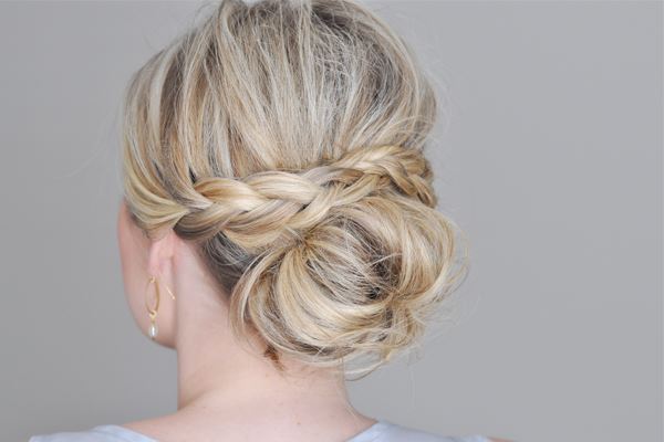 2. ขยำผมด้านหลังเป็นก้อน แล้วมัดด้วยหนังยางให้เป็นมวยต่ำ จากนั้นดึงผมออกให้ยุ่งนิดๆ