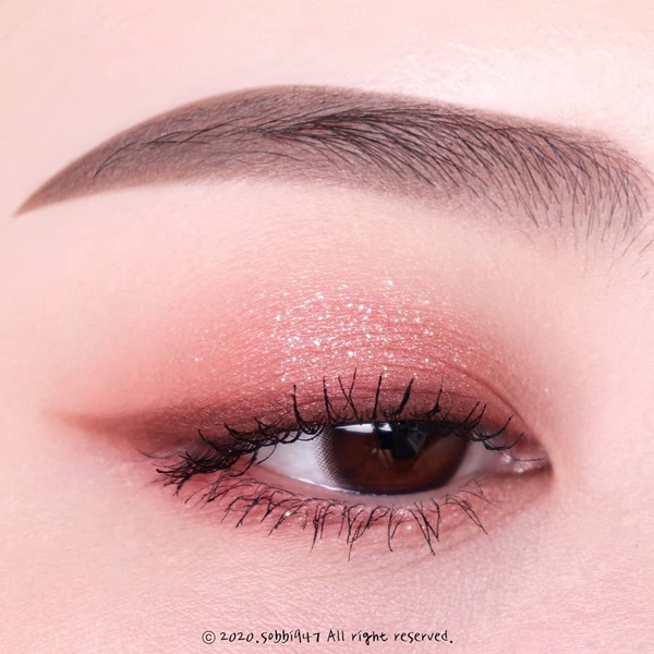 4. จากนั้นแตะอายแชโดว์โทนส้มอมแดงแบบเนื้อชิมเมอร์ทับลงไป เน้นช่วงกลางเปลือกตา