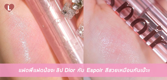 เรื่องความสวยหรูดูดี หยิบมาทาแล้วรู้สึกเริ่ดๆ ก็ถือว่าไม่แพ้กันเลยค่ะ ดูดีทั้งคู่! ส่วนเนื้อลิปก็สีคล้ายกันสุดๆ ดิออร์จะมีความเบาใสคุณหนูๆ กว่านิดนึง ส่วนเอสปัวร์จะมีความชมพูน่ารักเกาหลี ซึ่งมองด้วยตาเปล่าบางทียังแยกไม่ออกเลยค่ะซิส ถ้าใครชอบสีโทนอื่น ดิออร์จะมีให้เลือกหลายหลายกว่า ส่วนเอสปัวร์มีให้เลือกโทนหลักๆ 3 สี ใครชอบแบบไหนก็ไปลองดูนะคะ ฝาแฝดกันสุดๆ Dior Lip Glow ราคาประมาณ 1,390 บาท Espoir Nowear Glow lip Balm ราคาประมาณ 775 บาทจ้า