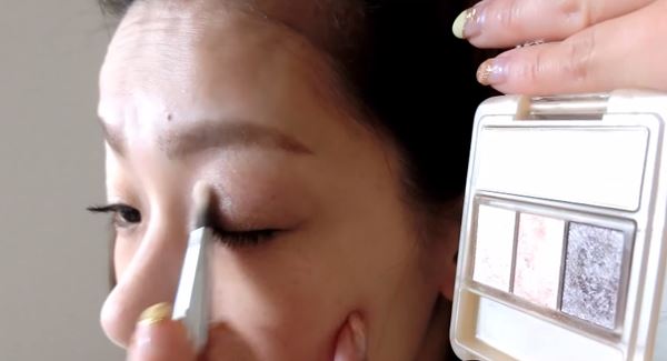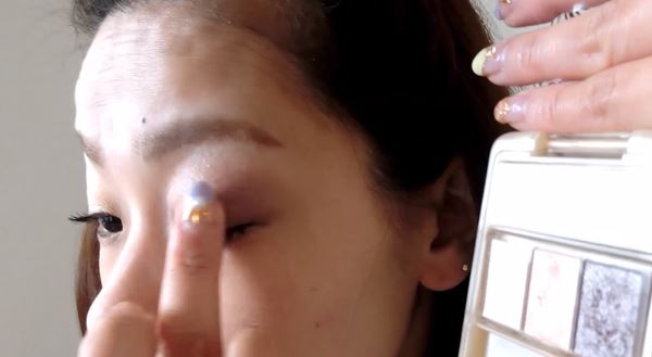 6. ลงอายแชโดว์สีน้ำตาลอมม่วงที่หางตา ใช้แปรงหรือนิ้วก็ได้ แล้วเบลนด์เข้ามาประมาณ 2/3 ของตา