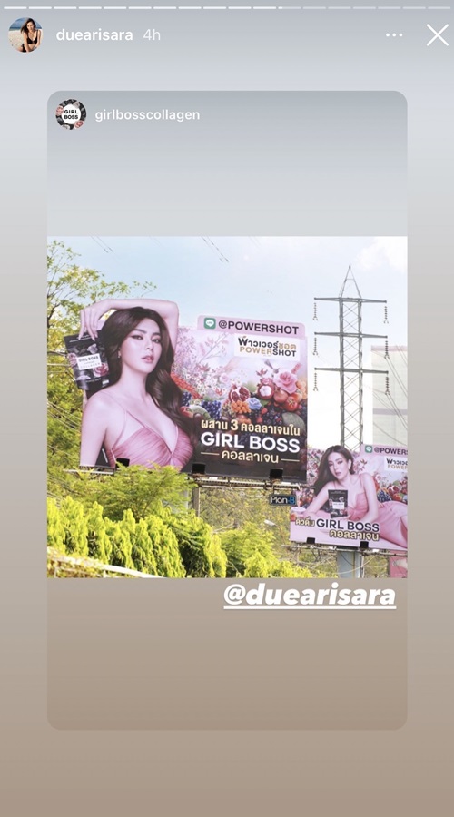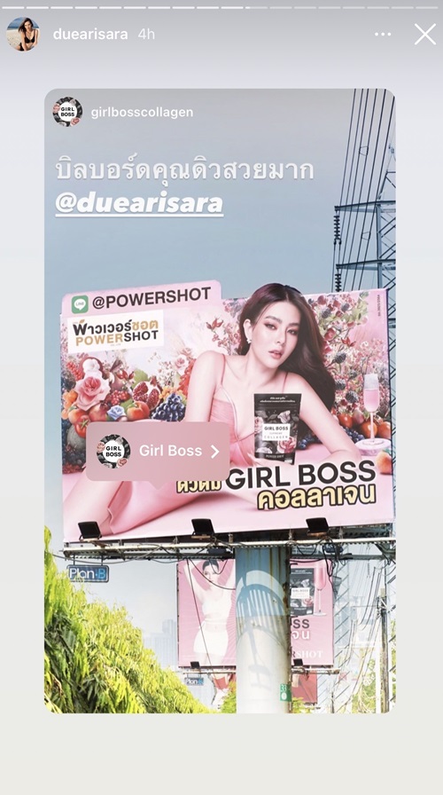 ล่าสุดเห็น ดิว อริสรา แอบควงแฟนหนุ่มเที่ยวดูไบ แต่ถึงตัวจะไปอยู่ซะไกล ก็ยังเห็นผลงานดิวอยู่บนป้ายบิลบอร์ดโฆษณาในไทยนะจ๊ะ เพิ่งขึ้นป้ายบิลบอร์ดแถวพระราม 4 ในฐานะพรีเซ็นเตอร์แบรนด์ Girlboss Collagen ที่ส่งไอจีบ่อยๆ จะเห็นว่าชีกินจริง ผิวดีจริง ถ้ากินแล้วสวยแซ่บจนขับรถผ่านยังต้องสะดุดตาขนาดนี้ เอ๊ะหรือว่าจะตามไปลองบ้างดีน้าาาา