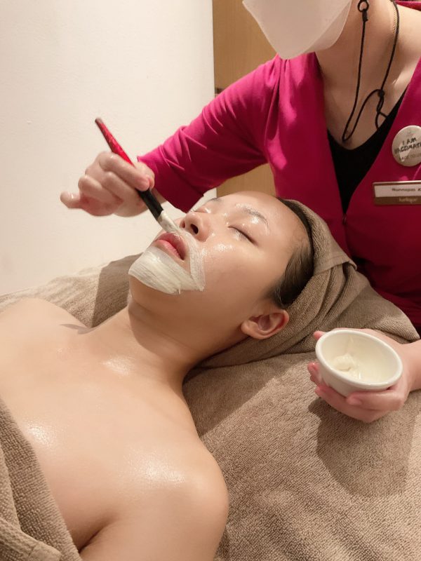 เมื่อสครับหน้าเสร็จก็มาต่อด้วยการมาร์คหน้าลดรอยแดงจากสิว พี่เขาก็จะผสมตัวมาส์กแล้วทาลงบนหน้าเราแบบนี้เลยโดยจะทิ้งมาส์กนี้ไว้สักแปปนึง