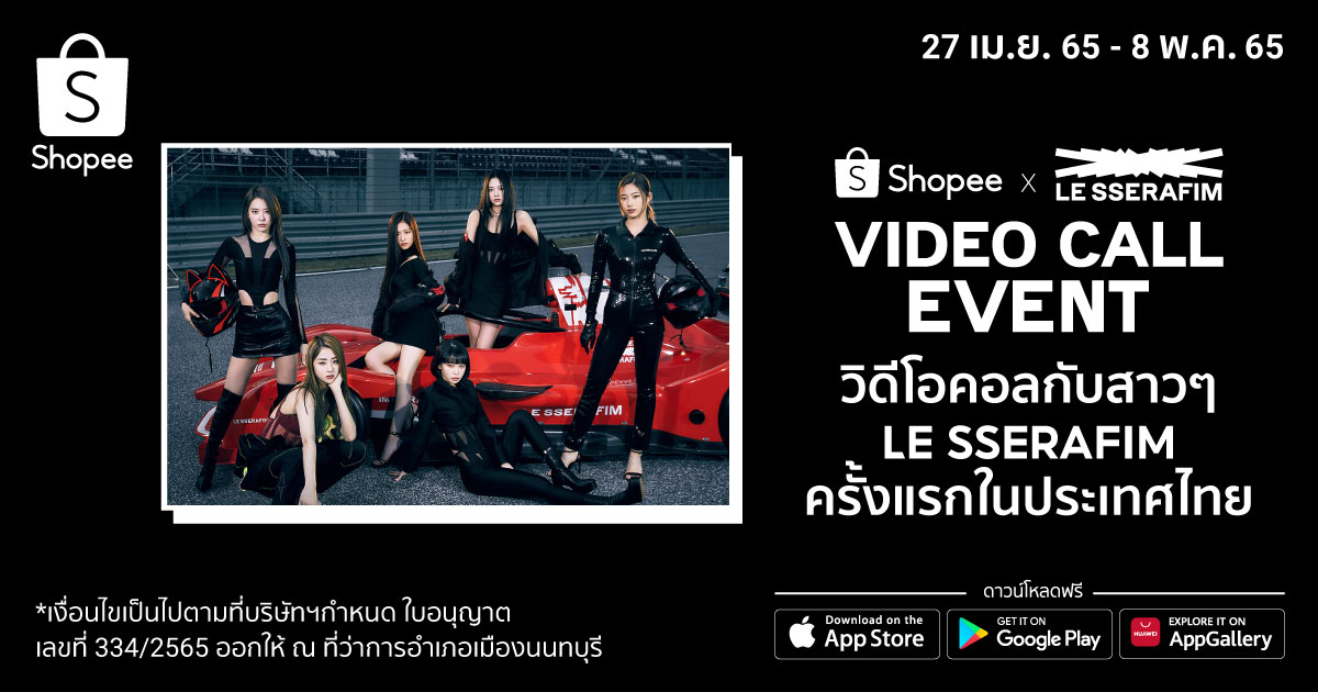 กรุงเทพฯ, 27 เมษายน 2565 – เพื่อฉลองการเดบิวต์วงอย่างเป็นทางการกับเกิร์ลกรุ๊ปที่กำลังมาแรงอย่างวง LE SSERAFIM ช้อปปี้ ผู้นำแพลตฟอร์มอีคอมเมิร์ซในเอเชียตะวันออกเฉียงใต้และไต้หวัน จึงส่งบิ๊กเซอร์ไพรส์สะเทือนทั้งวงการอีคอมเมิร์ซและเคป๊อป จัดกิจกรรมสุดเอ็กซ์คลูซีฟครั้งแรกกับ Shopee x LE SSERAFIM Video Call Event หนึ่งในกิจกรรมเฉลิมฉลองการเริ่มต้นของมหกรรม Shopee 5.5 Half Price Sale ลดสนั่น หั่นครึ่งราคา ที่เปิดโอกาสให้แฟน ๆ ผู้โชคดีมีทแอนด์กรี๊ดกับเมมเบอร์สาวทั้ง 6 จากวงแบบตัวต่อตัวในรูปแบบของวิดีโอคอล