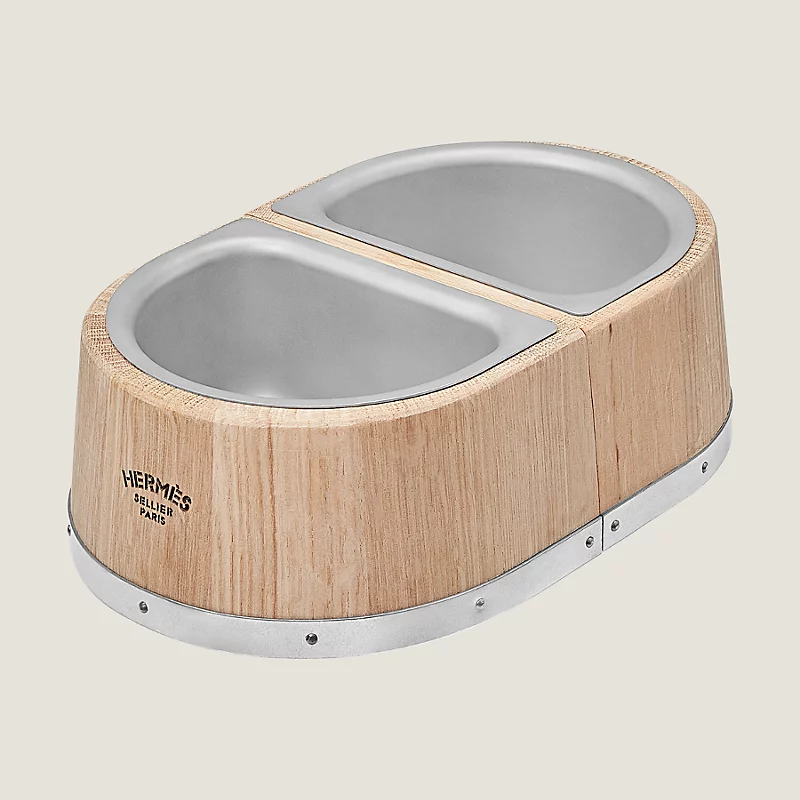 ชามอาหารสุนัขที่ทำจากไม้โอ๊ค ได้รับแรงบันดาลใจจากลวดลาย “Chaine d’Ancre” ที่เป็นเอกลักษณ์ สามารถแยกออกเป็นสองโถแยกกันได้ด้วยแม่เหล็กตรงกลาง ชามสแตนเลส 2 ใบที่ถอดออกได้ เรียกได้ว่าเรียบง่ายแต่ดูแพงสุดๆ