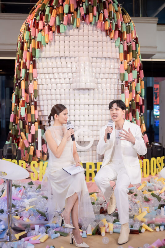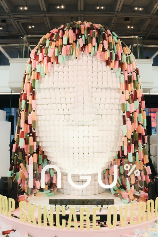 สำหรับงาน Stop Skincare Overdose Art Installation จัดขึ้นที่ลาน Atrium 2 ชั้น G ศูนย์การค้าสยามเซ็นเตอร์ โดยผลงาน Art Installation Ms.Overdose นับเป็นจุดเช็กอินสำคัญที่จัดแสดงโดดเด่นใจกลางงาน การสร้างสรรค์ผลงานชิ้นนี้ทาง INGU ต้องการสื่อสารกับผู้ที่มีปัญหาผิวและชี้ให้เห็นถึงความสำคัญของการหยุดการใช้สกินแคร์มากเกินความจำเป็นกับผิวของตนเอง และหันกลับมาดูแลผิวด้วยสกินแคร์พื้นฐาน 3 ขั้นตอน คือ “ล้าง – บำรุง – ปกป้อง” ทั้งนี้ Ms.Overdose ถูกสร้างจากขวดสกินแคร์จำนวน 7,000 ชิ้น ก่อตัวกันเป็นใบหน้าของหญิงสาวเพื่อตอกย้ำถึงพฤติกรรมการใช้สกินแคร์เกินขนาดของคนทั่วไป ทั้งนี้จากผลการศึกษาแสดงให้เห็นว่าค่าเฉลี่ยการใช้สกินแคร์ตลอดชีวิตของคนทั่วไปมีมากถึง 5,846 ชิ้น (Bianca, 2014)* และในความเป็นจริง ผิวหน้าเป็นอวัยวะที่ฉลาด จึงไม่ต้องการสกินแคร์จำนวนมากเกินไปมาทำหน้าที่แทน ภายในงานจึงรายล้อมไปด้วยกิจกรรม #StopSkincareOverdose ประกอบด้วย 3 Stations ที่จะมาบอกเล่าถึง Skincare Routine พื้นฐานที่ผิวต้องการง่ายๆ แค่ 3 ขั้นตอนกับผลิตภัณฑ์ Essential Series เริ่มจาก Station : Cleanse (ล้าง) Hydrating Gentle Cleanse , Station : Moisturise (บำรุง) Green Tea Calming Cream และ Station : Protect (ปกป้อง) Super-Light Soothing Sunscreen SPF 50+ PA++++ และมอบความสนุกและความเข้าใจที่ถูกต้องเกี่ยวกับการดูแลผิวหน้าพื้นฐาน พร้อมรับผลิตภัณฑ์ขนาดทดลองจาก INGU เมื่อร่วมสนุกกับกิจกรรมตามเงื่อนไข นอกจากนี้วันเปิดงานยังได้รับเกียรติจาก คุณอิ๊ง – ชยธร กิติยาดิศัย และ คุณธัช-กีรธัช กิติยาดิศัย กรรมการบริหารบริษัท อิ๊ง ซีเค จำกัด ให้การต้อนรับแขกทุกท่าน พร้อมด้วย คุณเป๋ – ธนวัต มณีนาวา ร่วมพูดคุยถึงแรงบันดาลใจในการสร้างสรรค์ผลงาน คุณแพร – อมตา จิตตะเสนีย์ หรือเป็นที่รู้จักกันดีในนาม Pearypie ร่วมพูดคุยเรื่อง ‘Sustainability beauty’ และคุณฟลุ๊ค – ธรรณพ แสงโอสถ อินฟลูเอนเซอร์ชื่อดัง flukkaron ร่วมแชร์ประสบการณ์ปัญหาผิวที่เคยเจอจากการใช้ Skincare Overdose