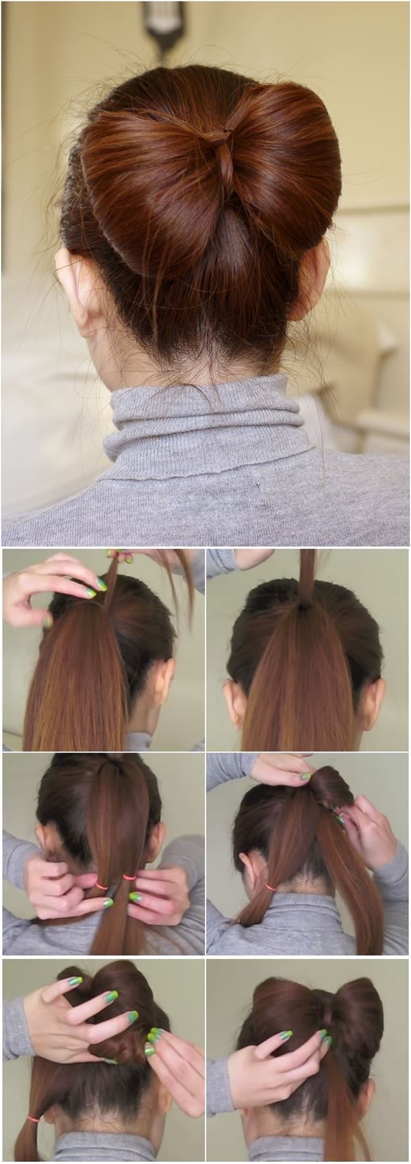 7. จับผมช่อหน้าลงมาปิดตรงกลางระหว่างโบว์ทั้งสองฝั่ง แล้วเก็บปลายผมใส่เข้าไปในโบว์ ติดกิ๊บเก็บรายละเอียดก็เสร็จแล้วค่ะ