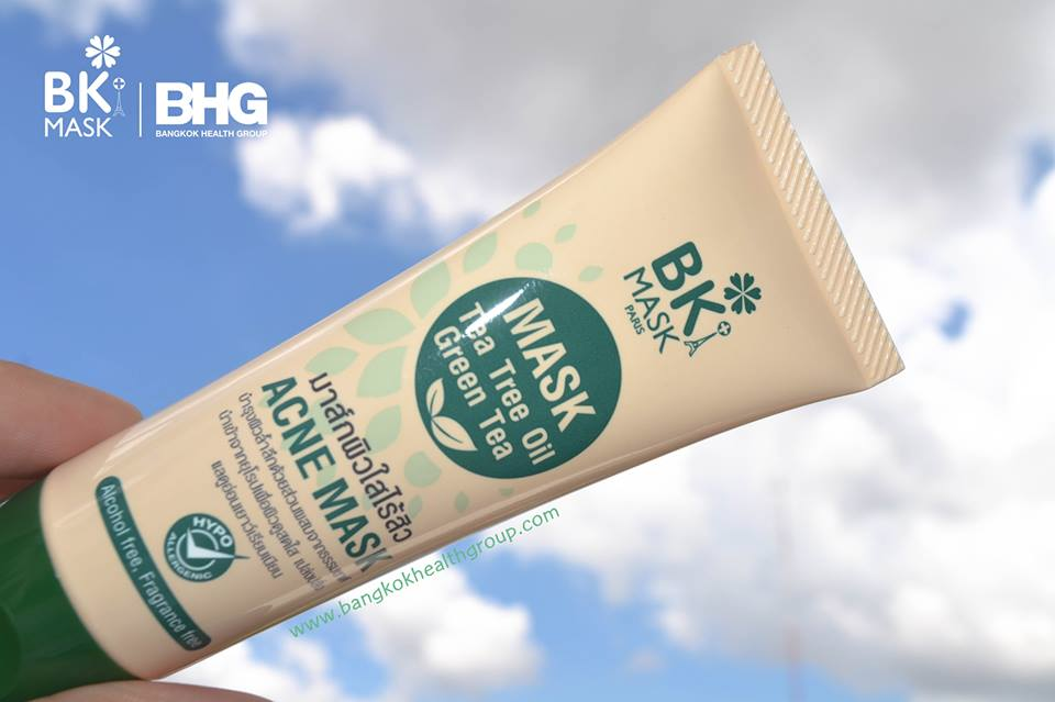 BK Acne Mask มาสก์เขียวตัวช่วยปัญหาสิว ให้ผิวใสไร้สิว ของแบรนด์ไทยคุณภาพระดับสากล ซึ่งประกอบด้วยสารสกัดจากธรรมชาติจากสมุนไพรแบบไทยๆ จากใบบัวบก ผลการวิจัยของสารสกัดใบบัวบกพบว่า ช่วยให้แผลสมานกันดีและแผลหายเร็วภายใน 7 วัน รวมเข้ากับสารสกัดจากธรรมชาตินำเข้าจากประเทศฝรั่งเศส ทำให้ได้มาสก์ที่เหมาะกับสภาพผิวของคนไทย ที่ช่วยให้สิวแห้งเร็วขึ้น ถามช่วยลดรอยดำรอยแดงจากสิวได้ด้วย BK+ Acne Mask ได้รับการรับรองการทดสอบ Hypo-Allergenic เพื่อรับรองว่า BK+ Acne Mask มีความอ่อนโยน ไม่ก่อเกิดอาการแพ้และระคายเคือง