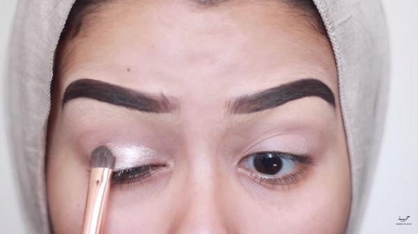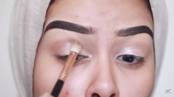 จากนั้นเริ่มที่การเขียนคิ้วโดยใช้แปรงแตะอายแชโดว์สีน้ำตาล แล้วเบลนด์ให้เป็นทรง