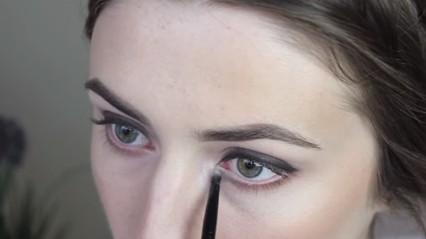 12. กรีดตาเส้นเล็กให้ชิดโคนขนตาด้วยเจลไลเนอร์สีดำ ใช้แปรงแตะอายแชโดว์สีน้ำตาลมาเบลนด์ทับไลเนอร์ให้ฟุ้ง