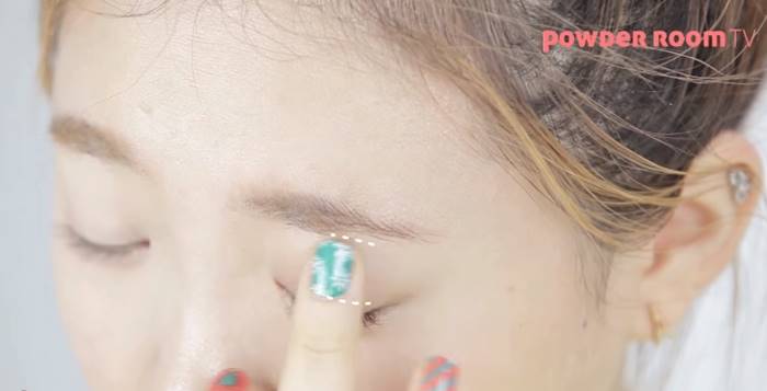 2. ใช้แปรงหัวดินสอ แตะอายแชโดว์สีน้ำตาลแล้วลงที่หางตาล่าง ให้ยาวเกินหางตาจริงออกไป โดยลงหางตาล่างเป็นตัววีมาบรรจบกันด้วย