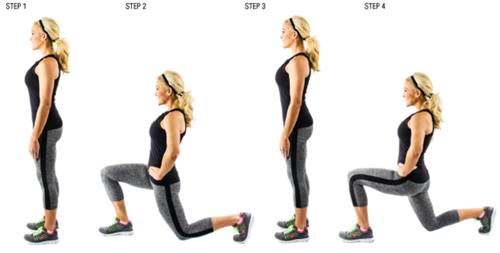 ท่านี้เป็นการก้าวเท้าไปข้างหน้า แล้วย่อตัวลงนะคะ โดยเริ่มจากการยืนตัวตรง ปลายเท้าแยกจากกันเล็กน้อย ก้าวขาข้างหนึ่งออกไปด้านหน้าระยะ 2 ก้าว แล้วย่อเข่าลง ให้หัวเข่าทำมุม 90 องศา หลังต้องตรงนะคะ ค้างไว้สัก 2 วินาที ก็กลับท่าเตรียมค่ะ จะทำซ้ำข้างเดิม หรือสลับข้างกันทำก็ได้นะคะ ทำข้างละ 8 – 15 ครั้งค่ะ