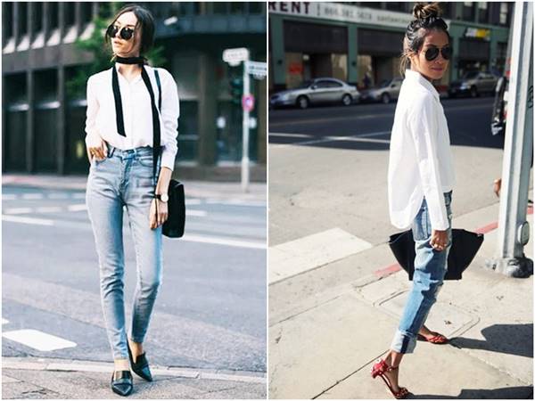 แน่นอนวาไม่มีอะไรจะคลาสสิกไปกว่าลุคเสื้อเชิ้ตสีขาว+กางเกงยีนส์อีกแล้ว เพราะแค่เสื้อเชิ้ตสีขาวตัวเดียว แล้วเปลี่ยนกางเกงยีนส์เป็นแบบต่างๆ ก็เหมือนได้ลุคใหม่ทุกวันแล้วนะฮ้าาา จะเป็นกางเกงยีนส์ขาด กางเกงยีนส์ขาเดฟ กางเกงยีนส์ขาม้า ใส่กับรองเท้าผ้าใบ รองเท้าส้นสูง หรือมีพร็อพเสริมเช่นหมวก ผ้าพันคอ ที่แตกต่างกันไป ก็ได้ลุคที่ไม่ซ้ำเดิมแล้ว เย้