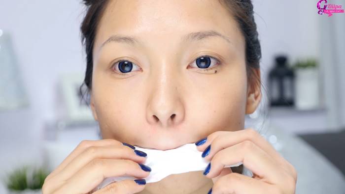 3. หลังจากทาลิปบาล์มทิ้งไว้สักพัก ก็ใช้กระดาษทิชชูเช็ดออกให้แห้ง (ควรแห้งเพื่อให้ติดทนนะจ๊ะ) จากนั้นก็ทาลิปทิ้นท์สีชมพูบางๆ ทั่วปาก