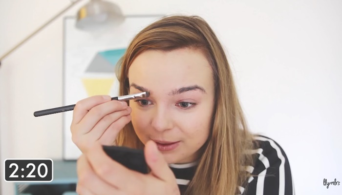 2. ใช้แปรงเขียนคิ้ว แตะฝุ่นเขียนคิ้ว แล้วร่างโครงคิ้วคร่าวๆ จากนั้นเบลนด์ให้ฟุ้งได้เลย