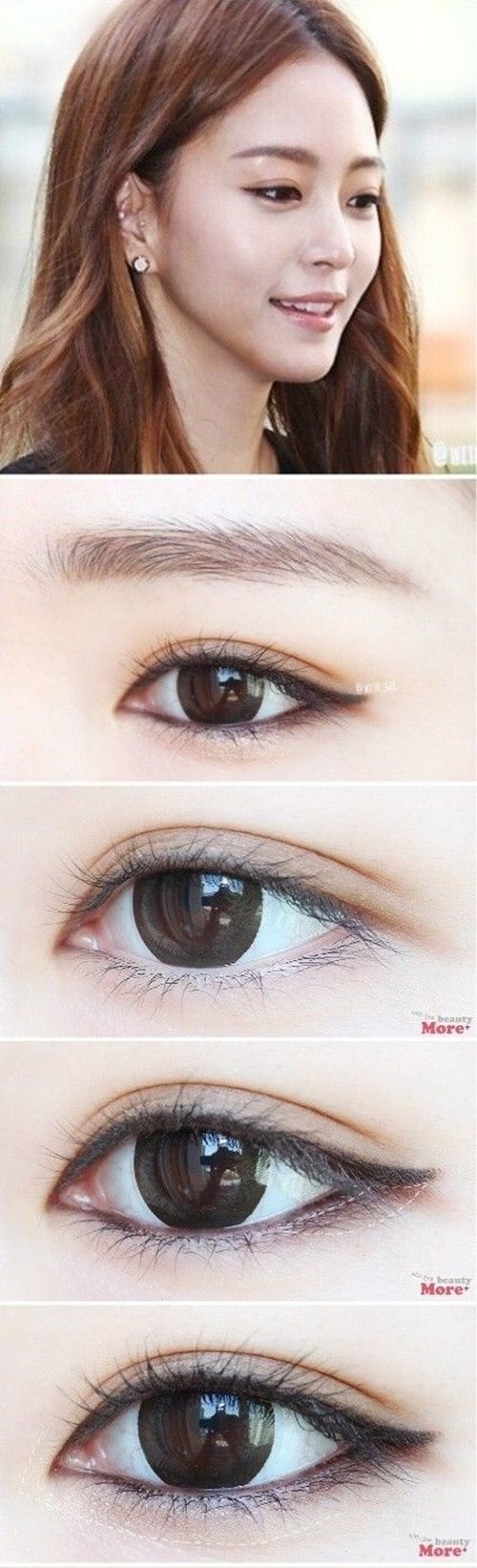 - ใช้อายไลเนอร์ดินสอสีดำ หรือน้ำตาลเข้ม เขียนให้ชิดโคนขนตาแล้วลากหางยาวออกไป
