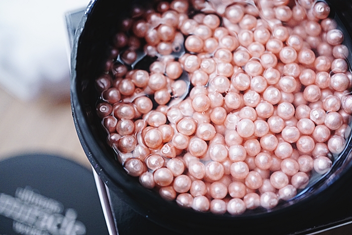 ขั้นตอนที่ 1 ตักเม็ดไข่มุกเซรั่ม (Serum-in-Pearl) ปริมาณ 1 ไม้พาย (ประมาณ 10-12 เม็ดไข่มุก) เทลงในถุงมาสก์