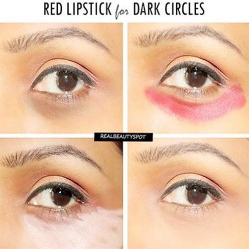 ใครที่ใต้ตาคล้ำหนักมากกก ใช้แป้งเด็กคู่กับลิปสติก ช่วยได้นะเธอออ วิธีการก็ง่ายๆ เลยค่า เอาลิปสติกสีแดงมาปาดใต้ขอบตา แล้วลงแป้งเด็กทับลิปสติกสีแดง จากนั้นก็ใช้แปรงแต่งหน้า เบลนด์สีให้นัว ก็เสร็จแล้วค่ะ