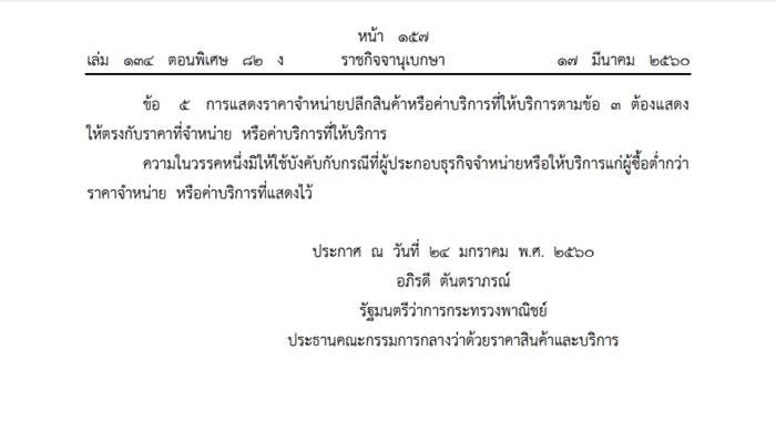 - การแสดงราคา ต้องตรงกับราคาที่จำหน่าย และค่าบริการ