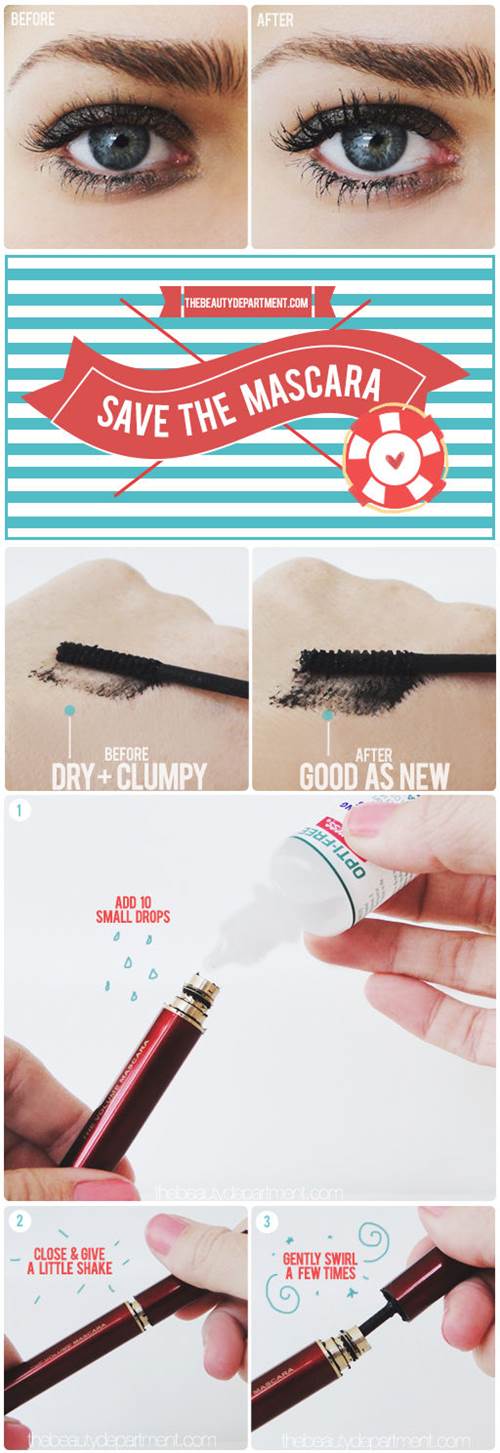 มาสคาร่าแห้ง ไม่ต้องกังวลค่า อยากใช้ให้คุ้มจริงๆ ก็สามารถหยดน้ำยาคอนเทคเลนส์, น้ำเกลือ หรือเบบี้ออยล์ลงไปในหลอดมาสคาร่าแล้วเขย่า รอสักพักก็สามารถนำกลับมาใช้ได้ใหม่อีกครั้งแล้วค่ะ