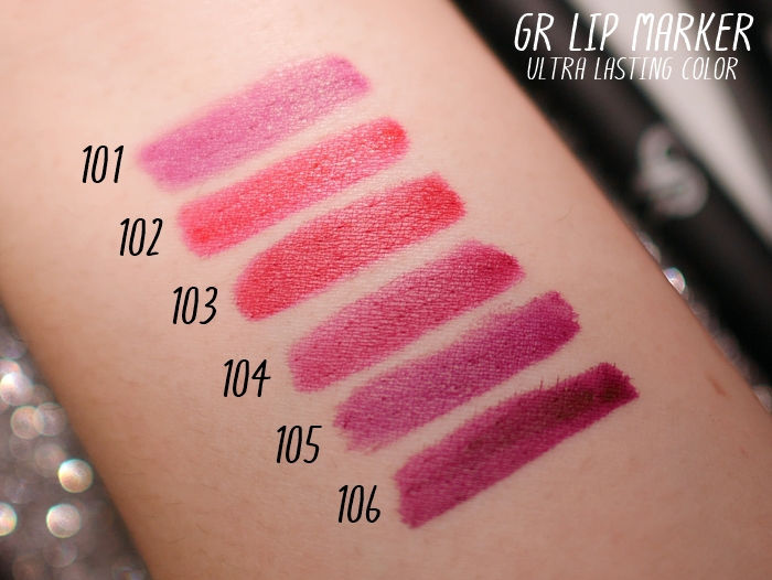 ตัวลิปหน้าตาเหมือนปากกาไฮไลท์สมัยเรียนเลยค่ะ หยิบง่ายใช้ง่าย ปลอดภัยต่อร่างกายแน่นอน มีส่วนผสมของ ALOE VERA และ VITAMIN E ช่วยบำรุงริมฝีปากด้วย มีให้เลือกถึง 6 เฉดสีด้วยกัน มาชมเนื้อสีแบบเน้นๆ กันได้เลย อ้อ! ขอบอกราคากันก่อนเลยดีกว่า GR LIP MARKER ค่าตัวอยู่ที่แท่งละ 259 บาทนะจ๊ะ