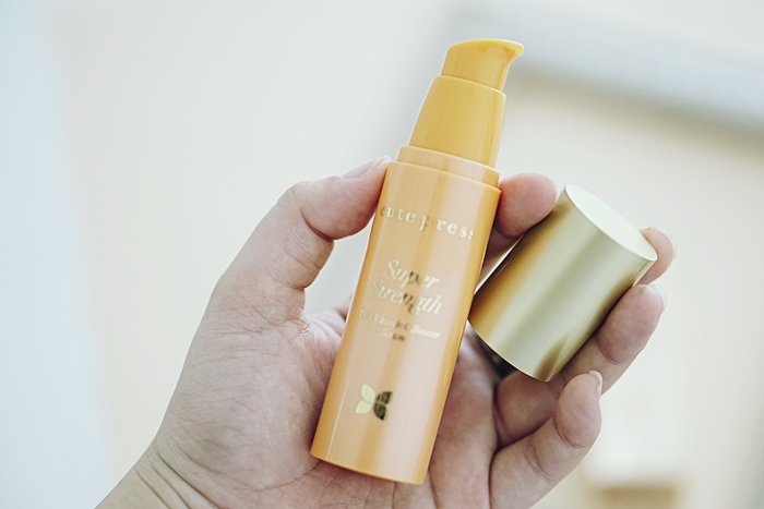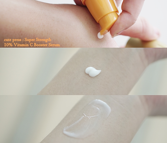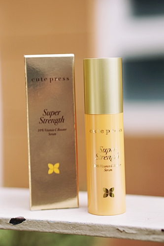 cute press Super Strength 10% Vitamin C Booster Serum (ซุปเปอร์ สเตร็งท์ 10% วิตามิน ซี บูสเตอร์ เซรั่ม) เซรั่มดูแลผิวหน้าที่ให้ผลแบบ 2 in 1 คือได้ทั้งผิวกระจ่างใสและลดริ้ยรอย ราคาเบาๆ แค่ 599 บาท เหมาะกับทุกเพศทุกวัย วัยรุ่นใช้ได้ผู้ใหญ่ใช้ดี คุณผู้ชายก็ใช้ได้นะจ๊ะ จุดเด่นของเขาคือส่วนผสมของวิตามิน C เข้มข้น ความพิเศษคือเขามีอนุพันธ์ของวิตามินซีเข้มข้นถึง 10% ที่ถูกเก็บเอาไว้ในรูปแบบแคปซูลนาโนช่วยให้ผิวแลดูกระจ่างใสเรียบเนียนขึ้น ผสานวิตามิน E ที่ช่วยเติมความชุ่มชื่นให้ผิวและเสริมการทำงานของวิตามินซีได้อย่างมีประสิทธิภาพ