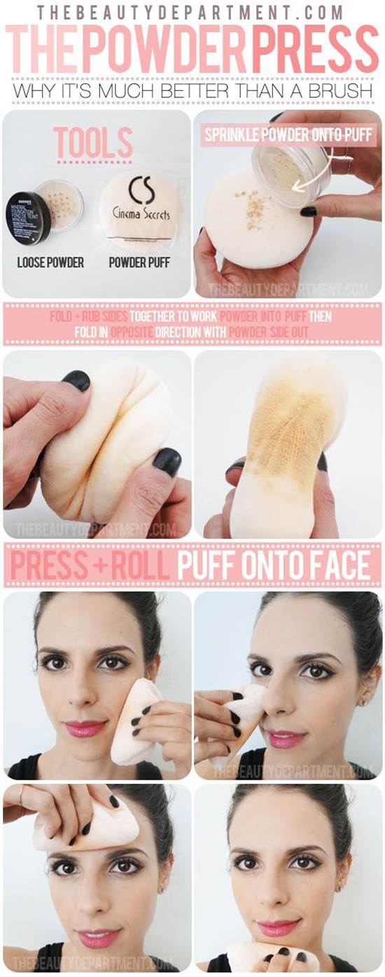 เคล็ดลับที่ 5. สุดท้ายของการแต่งหน้า ก็คือการลงแป้งฝุ่นเพื่อล็อคเมคอัพและเพื่อป้องกันความมันนะคะ โดยหากใช้พัฟแต่งหน้าลงแป้งฝุ่น จะช่วยให้แป้งฝุ่นติดลงบนหน้าได้ดียิ่งขึ้น โดยวิธีก็ง่ายๆ ค่ะ ใช้แป้งฝุ่นโรยลงบนพัฟแล้วนำมาตบลงบนหน้า ให้แป้งฝุ่นฟุ้งๆ หน่อย แป้งจะได้ติดนิดนึง แล้วค่อยใช้แปรงแต่งหน้าปัดแป้งฝุ่นที่เกินออก ง่ายๆ แบบนี้แหละค่า