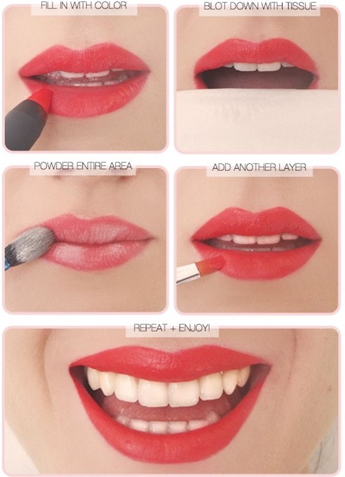 ลิปสติกต่อให้สีสวยแต่ว่าไม่ติดทนทาไปก็เท่านั้น วิธีที่จะทำให้ลิปติดทนคือใช้แป้งฝุ่นลงทับบางๆ ลงบนริมฝีปากค่ะ อย่าปล่อยให้สีลิปสติกสวยๆต้องเลือนหายระหว่างวันเลยเนอะ