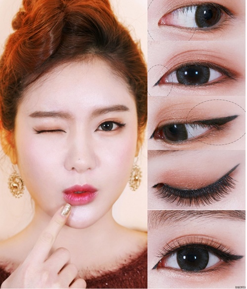 เอาใจสาวสายเกาหลีกันหน่อยดีกว่า ใช้อายแชโดว์สีน้ำตาลอมส้มมีชิมเมอร์ทาทั่วเปลือกตาตามด้วยกรีดอายไลเนอร์เฉี่ยวๆ ดูมีลูกเล่นเล็กน้อยแล้วทาปากไล่ระดับสีแบบ Ombre Lips ก็ดูน่ารักสดใสใช่ย่อยเลยนะเธอ