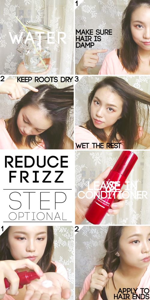 1. ค่อยๆ พรมน้ำลงให้ทั่วผม พอให้เปียกนิดๆ พยายามอย่าให้เปียกไปถึงหนังศีรษะ แต่ห้ามแฉะเด็ดขาด! แล้วใส่ทรีทเมนท์บำรุงผม เพื่อให้ผมดูชุ่มชื่นไม่ฟูฟ่อง
