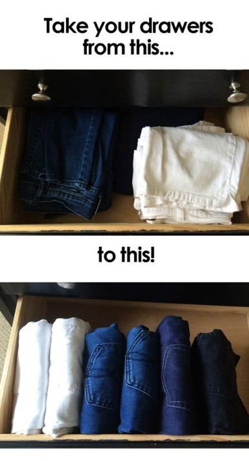 กางเกงขายาวและกางเกงยีนส์ เป็นเสื้อผ้าที่ค่อนข้างหนาและหนัก ทำให้กินพื้นที่ในตู้เสื้อผ้าเยอะอยู่นะคะ สาวๆ สาวมารถพับแล้ววางตั้งในลิ้นชัก ก็ช่วยให้เก็บได้เป็นระเบียบ หยิบใช้ง่ายดีด้วยนะคะ